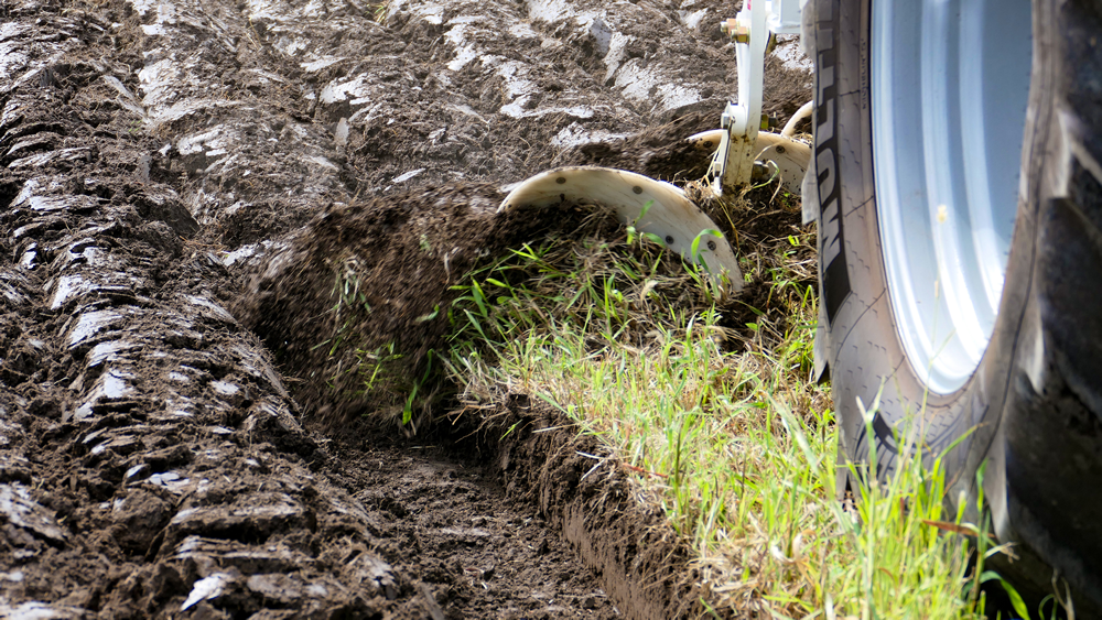 プラウ耕は反転耕起です。土を塊のまま引き起こし、天地をひっくり返します。